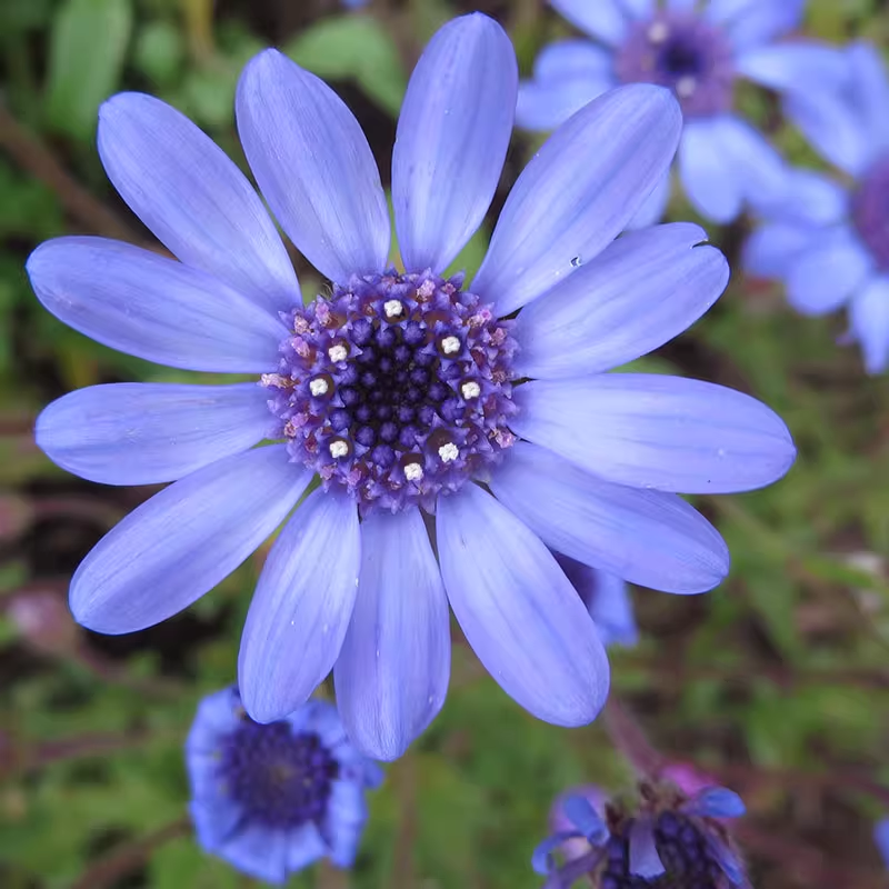 Tongue flowers light sky blue. tubular flowers cobalt blue. There is a consistent floret structure. Florets tubular. radially symmetrical. or ligulate and bilaterally symmetrical. or corolla tubular with lobes 2-lipped. Most of the florets are densely arranged. covered with involucral bracts to form a consistent flower head. The flower size is about 2cm in diameter. the flower center is yellow. and the petals are white or light blue.