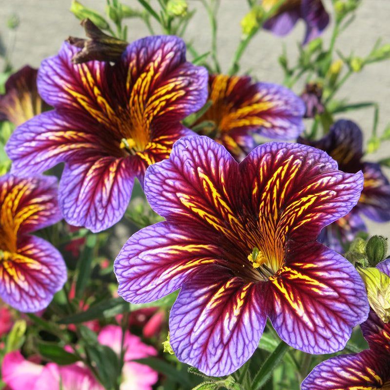The corolla is obliquely funnel-shaped. and the flowers are white. yellow. reddish-brown. red. crimson. magenta. purple and other colors. with blue. yellow. brown. red and other color lines on them. with velvety luster. and the flowering period is spring.