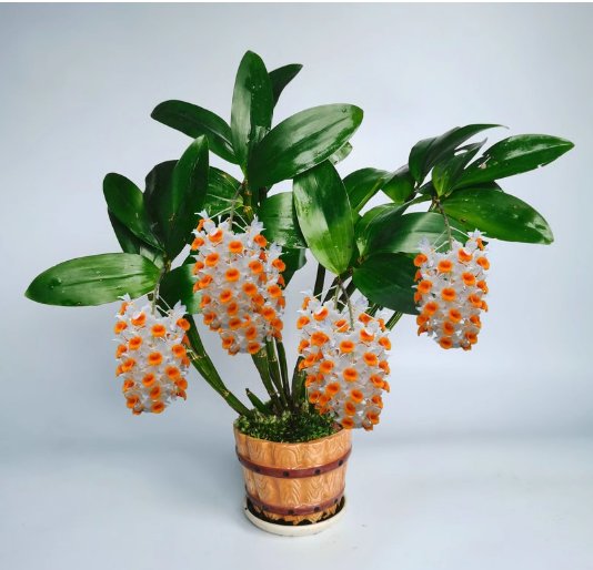 This captivating orchid showcases a unique and striking display of numerous tiny. white flowers with vibrant orange centers. forming a dense and mesmerizing cluster.