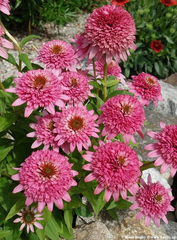 Noted for its compactness and sturdy habit. Echinacea purpurea 'Butterfly Kisses' is a particularly attractive double coneflower with large. fragrant. bright pink ray flowers. 3 in. across (7 cm). adorned with a darker pompom central cone. Well branched. its numerous flowering stems are strong and held upright. Blooming from midsummer until frost. this dwarf coneflower provides a vibrant floral display and is perfect for perennial borders. small gardens or patio containers. Can be used in fresh cut or dried arrangements.