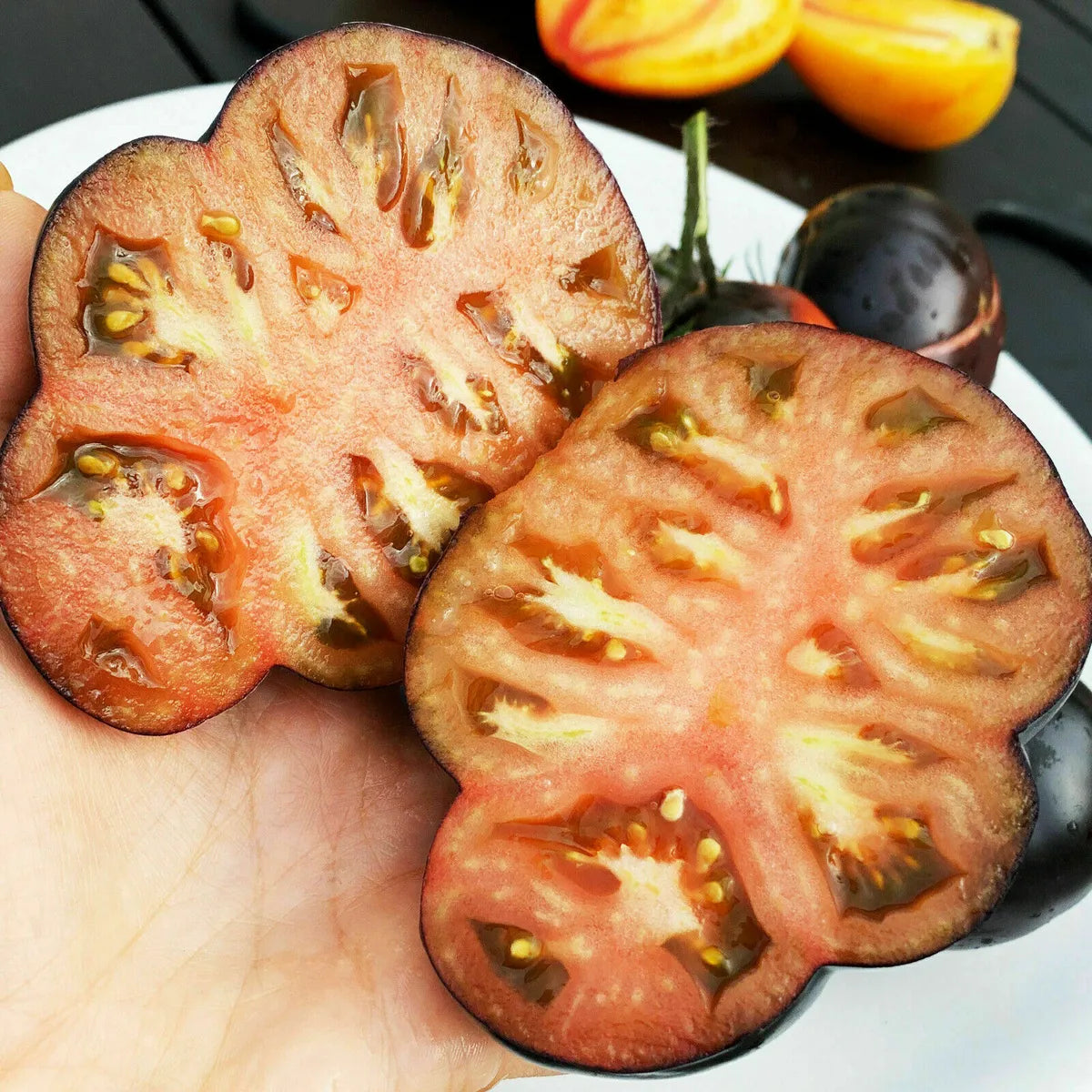 We love these luminescent slicers ripening from bright plum to rich. velvety black blushing brick red as they soften. ripening fully with rich heirloom flavor.
