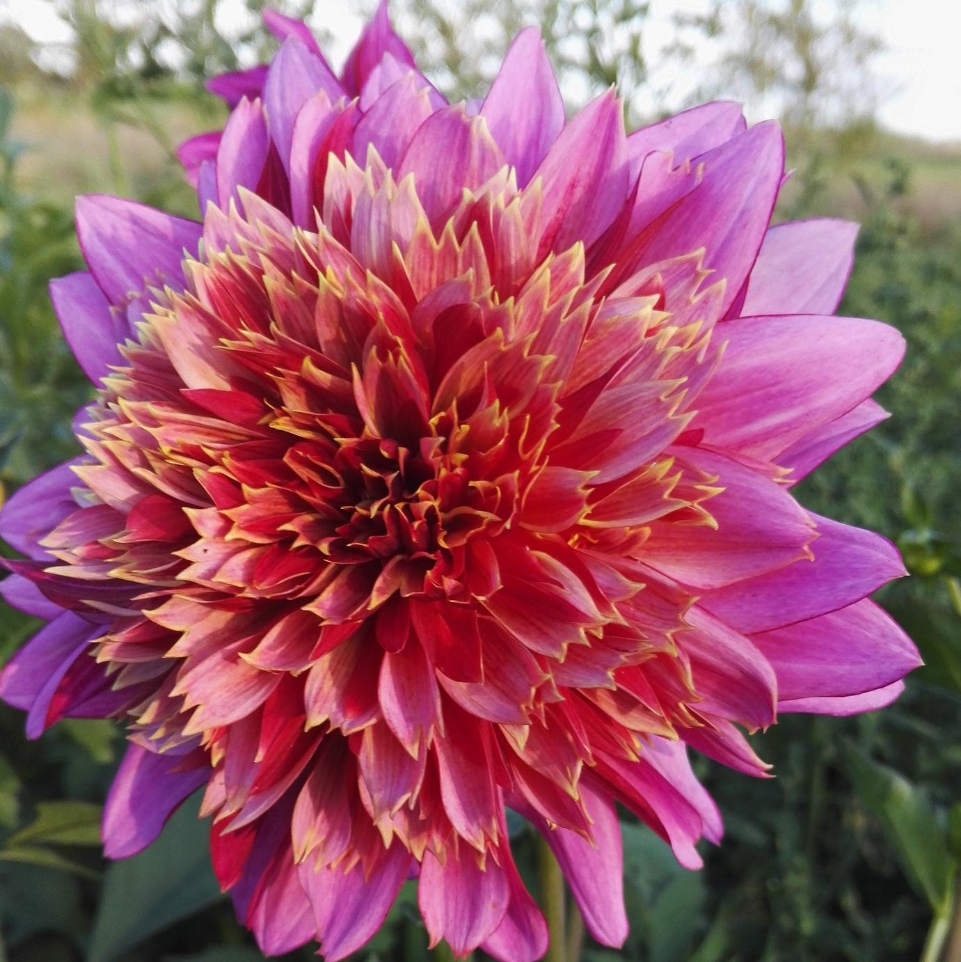 Product Description Dahlia 'Myrtle's Folly' 'Myrtle's Folly' is a large frizz ball of raspberry and golden twisted petals with an 8”... Read more