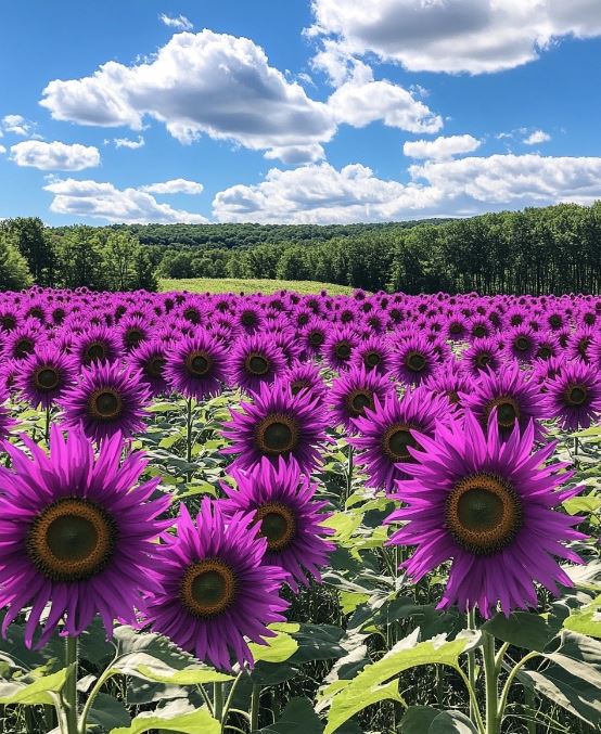 A breathtaking field of sunflowers featuring vibrant purple petals. creating a stunning contrast against the bright blue sky and lush green landscape. This unusual and captivating color variation turns a typical sunflower field into a mesmerizing spectacle of color and beauty.