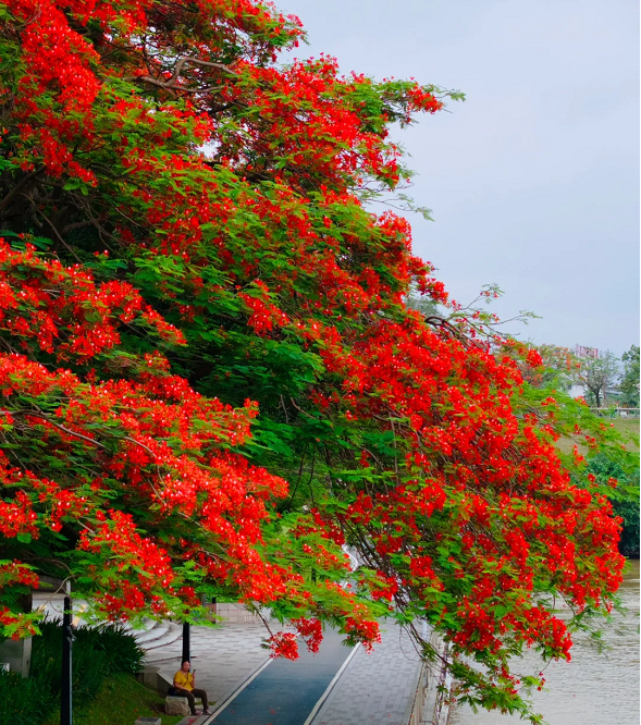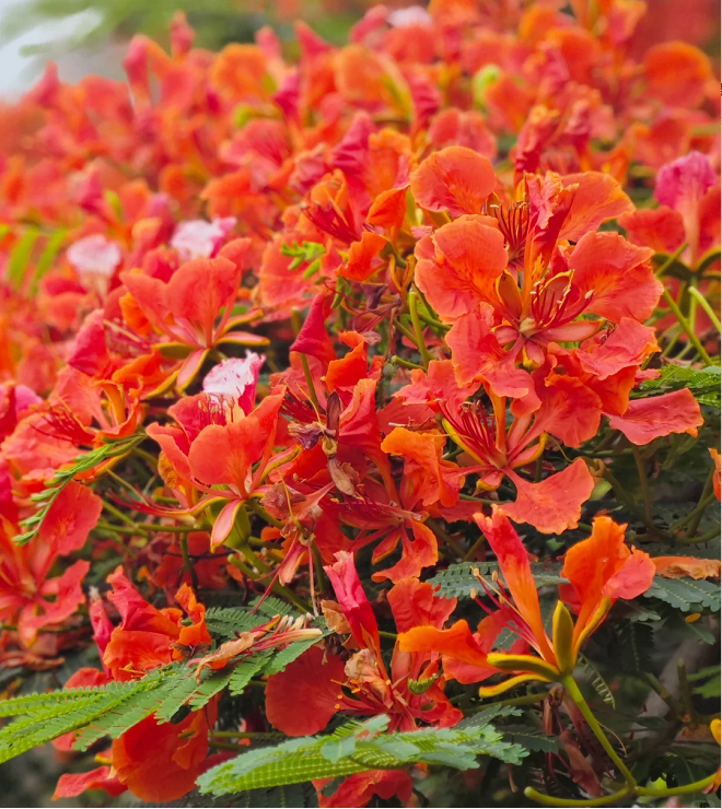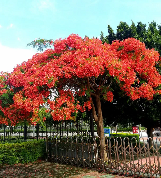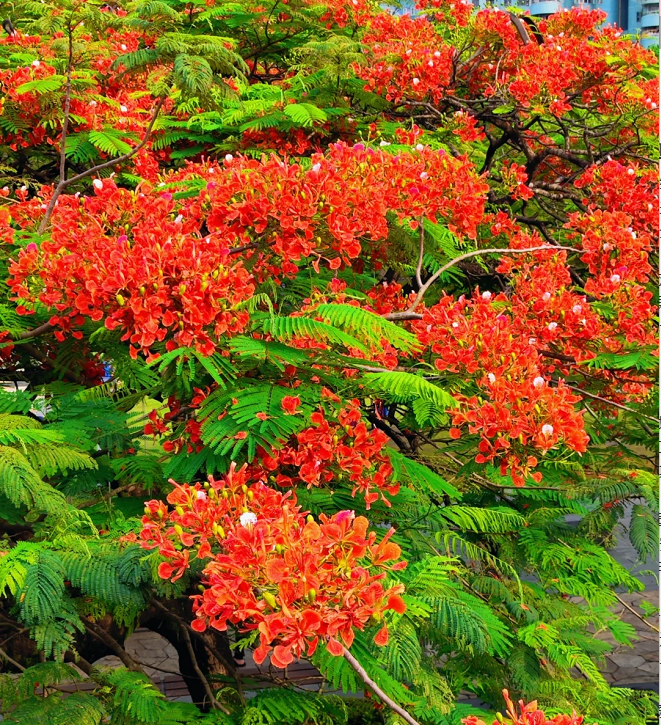 Do not be put off by its small name "Delonix regia" which in Greek means "visible claw". Its flowers. which can indeed resemble to claws. will scratch your pupil only by the splendor of their flowering and the profusion of their clusters!