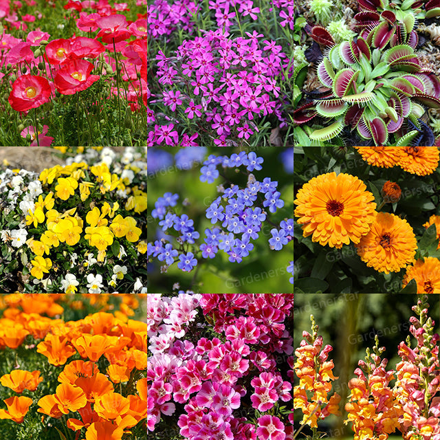 Plant Mix Pack Contents: Calendula. Cornflower Tall Blue. Godetia. Plains Coreopsis. California Poppy. Spurred Snapdragon. Baby Blue Eyes. Red Corn Poppy. Red Poppy Shirley. Phlox Annual Red. Catchfly. Johnny Jump Up. Forget Me Not. Mix contents are subject to change.